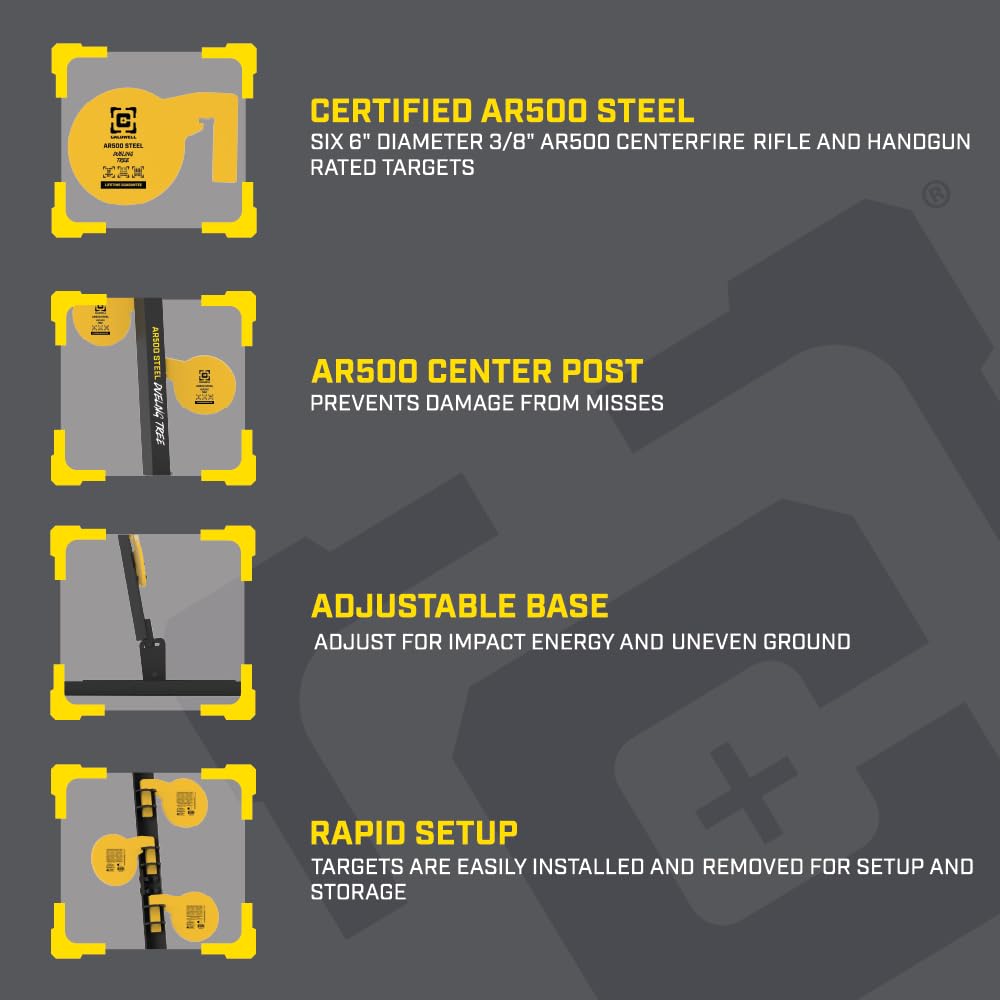 - AR500 Steel: Designed six 3/8" rifle-rated, AR500 steel targets with bright yellow coating for increased visibility and durable construction to withstand years of use